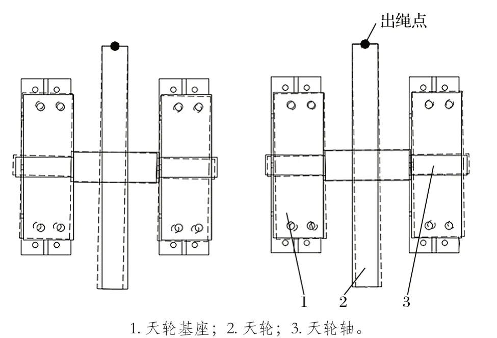 調(diào)整天輪和鋼絲繩內(nèi)外偏角的原則,需保證內(nèi)外偏角值滿足《金屬非金屬礦山安全規(guī)程》規(guī)定,同時還要確保出繩點位置不改變,即出繩點應(yīng)維持在罐籠中 心位置的正上方,保證提升容器穩(wěn)定,如圖 2 所示。θ 為 1 號天輪和基座整體旋轉(zhuǎn)的角度,以出繩點為原點順時針轉(zhuǎn)動;B1 和 B2 為調(diào)整之前的內(nèi)外偏角,圖片′為調(diào)整之后的內(nèi)外偏角,2 號天輪和 1號天輪的調(diào)整方式一致,僅旋轉(zhuǎn)方向為逆時針方向。